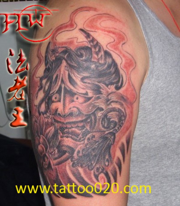 男人后肩背时尚经典的黑灰般若纹身图案_般若纹身图案大全_纹身图吧