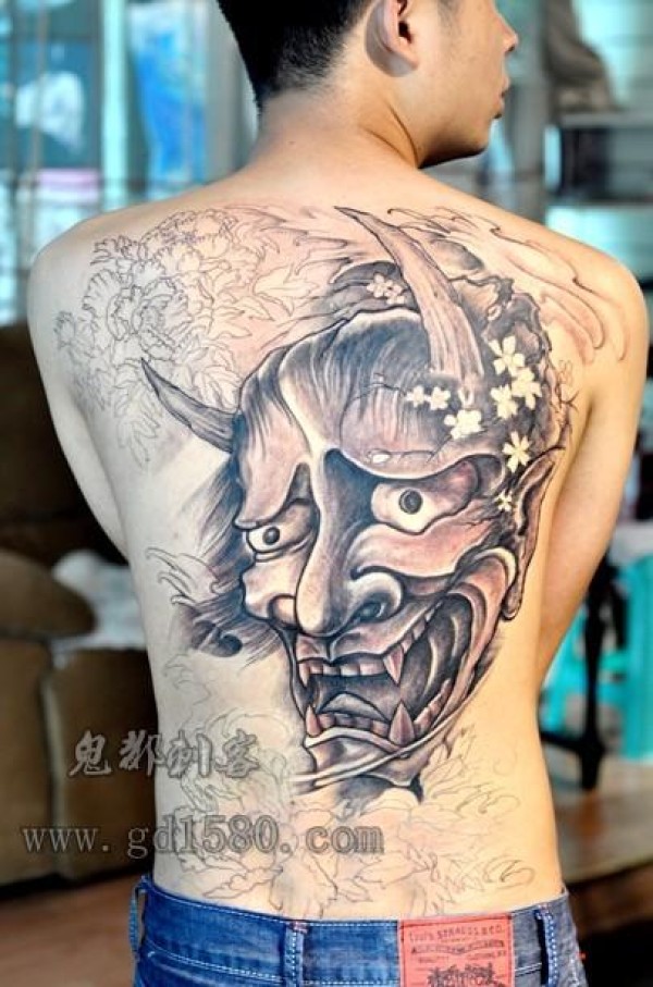 男人后肩背时尚经典的黑灰般若纹身图案_般若纹身图案大全_纹身图吧