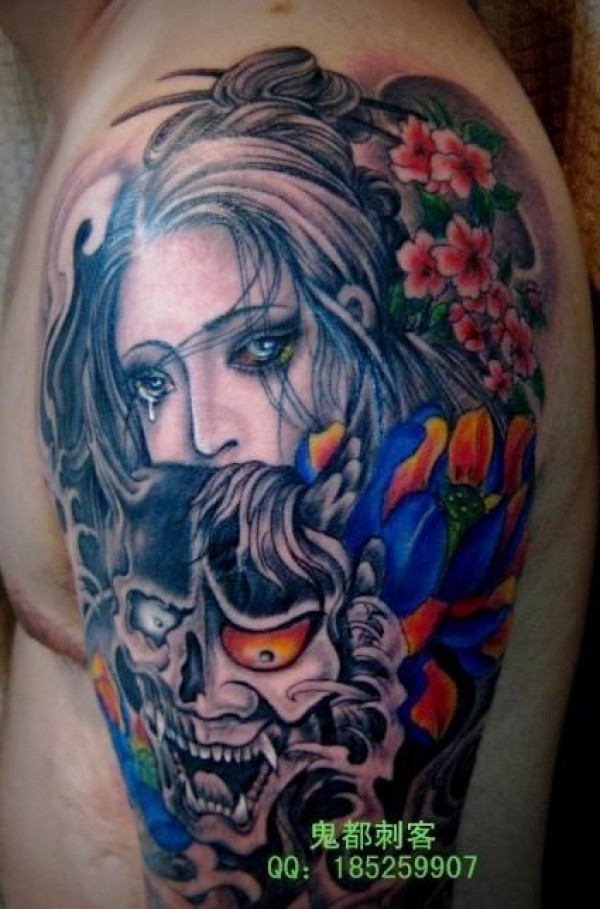 手臂一款经典很酷的欧美彩色般若纹身图案_般若纹身图案大全_纹身图吧