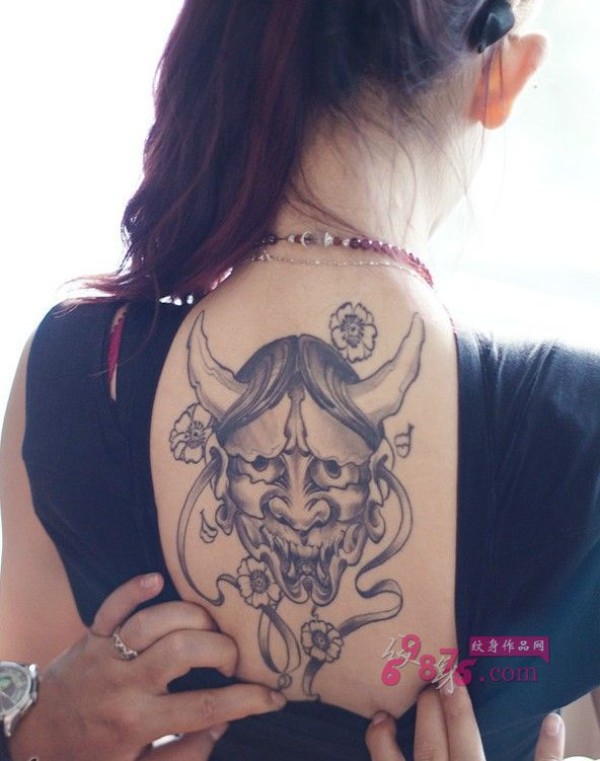 男人后肩背时尚经典的黑灰般若纹身图案_般若纹身图案大全_纹身图吧