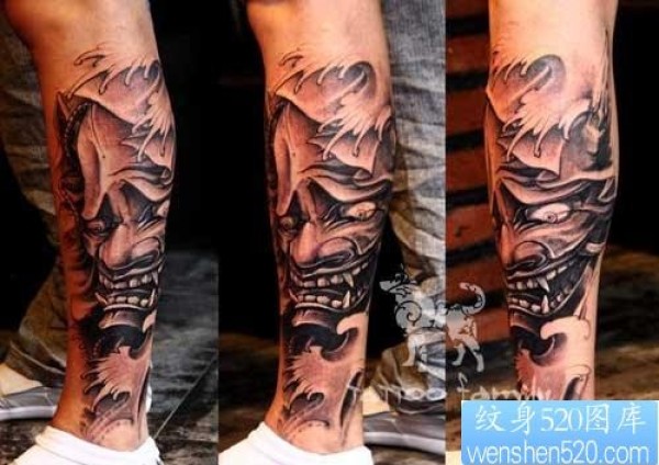 男人腿部经典帅气的黑灰般若纹身图案_般若纹身图案大全_纹身图吧