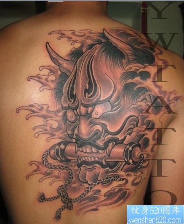 男人后肩背时尚经典的黑灰般若纹身图案_般若纹身图案大全_纹身图吧