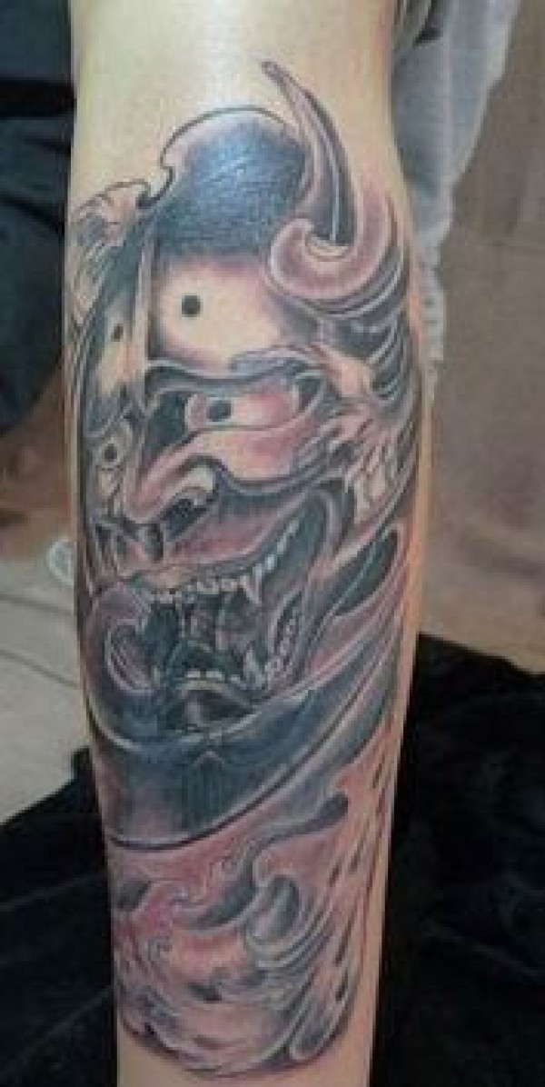 男人腿部经典帅气的黑灰般若纹身图案_般若纹身图案大全_纹身图吧