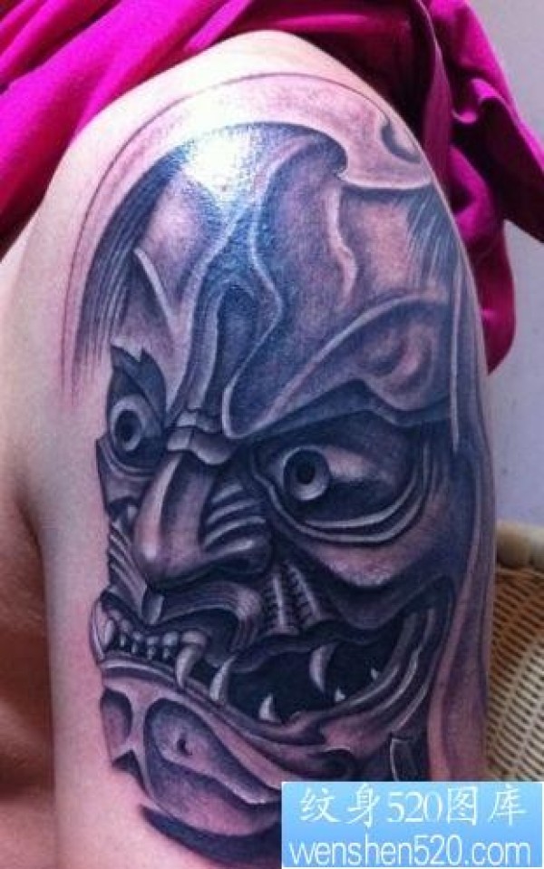 男人后肩背时尚经典的黑灰般若纹身图案_般若纹身图案大全_纹身图吧