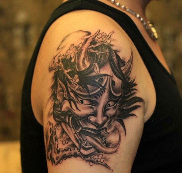 男人后肩背时尚经典的黑灰般若纹身图案_般若纹身图案大全_纹身图吧