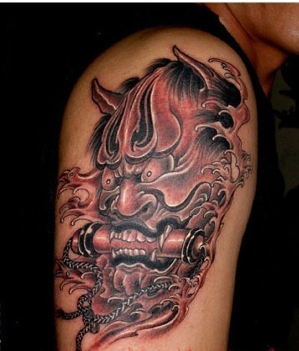 男人后肩背时尚经典的黑灰般若纹身图案_般若纹身图案大全_纹身图吧