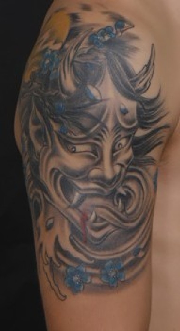 男人后肩背时尚经典的黑灰般若纹身图案_般若纹身图案大全_纹身图吧