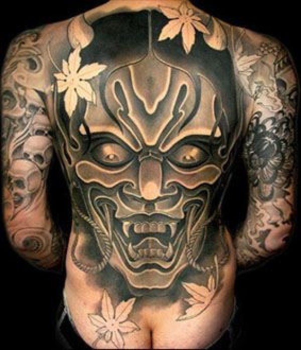 男人后肩背时尚经典的黑灰般若纹身图案_般若纹身图案大全_纹身图吧