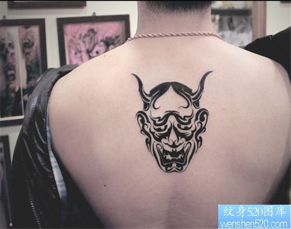 男人后肩背时尚经典的黑灰般若纹身图案_般若纹身图案大全_纹身图吧