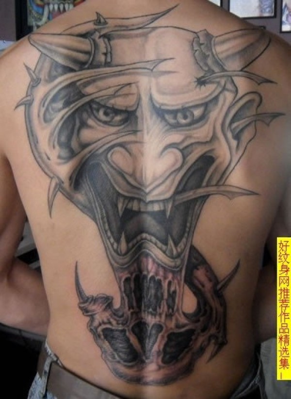 男人后肩背时尚经典的黑灰般若纹身图案_般若纹身图案大全_纹身图吧