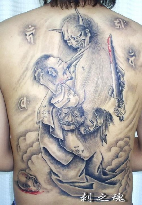男人后肩背时尚经典的黑灰般若纹身图案_般若纹身图案大全_纹身图吧