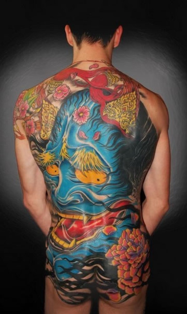 男士后背大型的般若纹身图彩绘包臀的般若带花_般若纹身图案大全_纹身图吧
