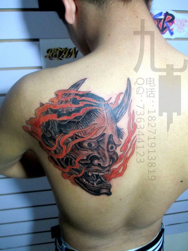 男人后肩背时尚经典的黑灰般若纹身图案_般若纹身图案大全_纹身图吧
