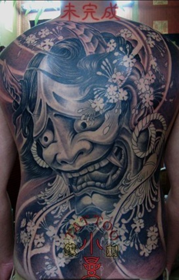 男人后肩背时尚经典的黑灰般若纹身图案_般若纹身图案大全_纹身图吧