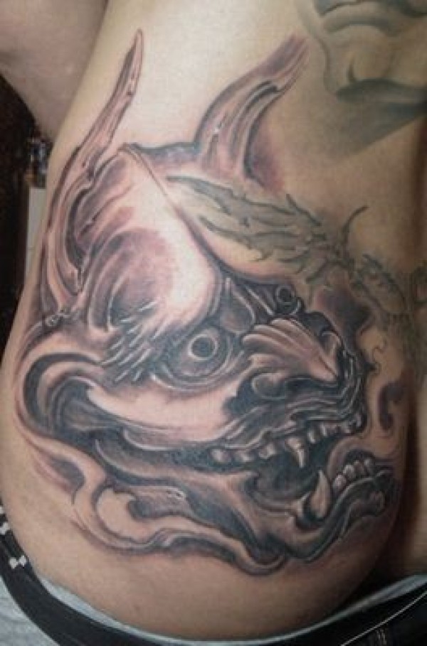 男人腿部经典帅气的黑灰般若纹身图案_般若纹身图案大全_纹身图吧