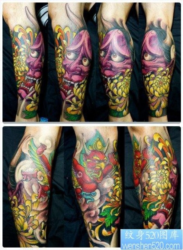 腿部帅气潮流的彩色般若纹身图案_般若纹身图案大全_纹身图吧