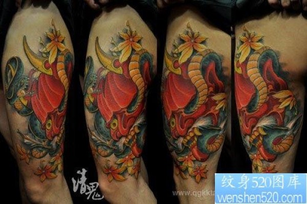 腿部帅气潮流的彩色般若纹身图案_般若纹身图案大全_纹身图吧