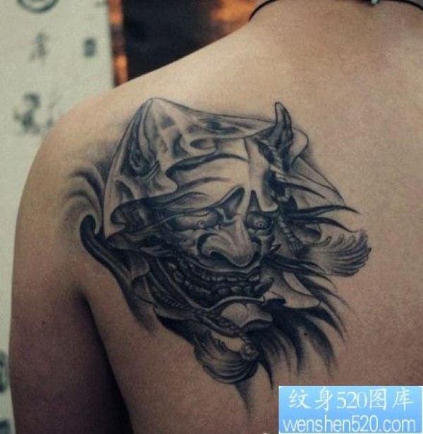 男人后肩背时尚经典的黑灰般若纹身图案_般若纹身图案大全_纹身图吧