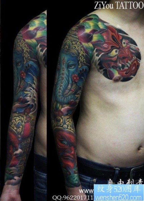 超酷的男生的半甲花臂般若象神纹身图片_般若纹身图案大全_纹身图吧