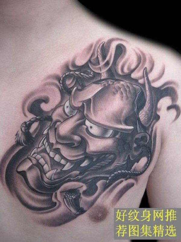 胸部阴森的素色般若图案纹身大全流云半甲般若_般若纹身图案大全_纹身图吧
