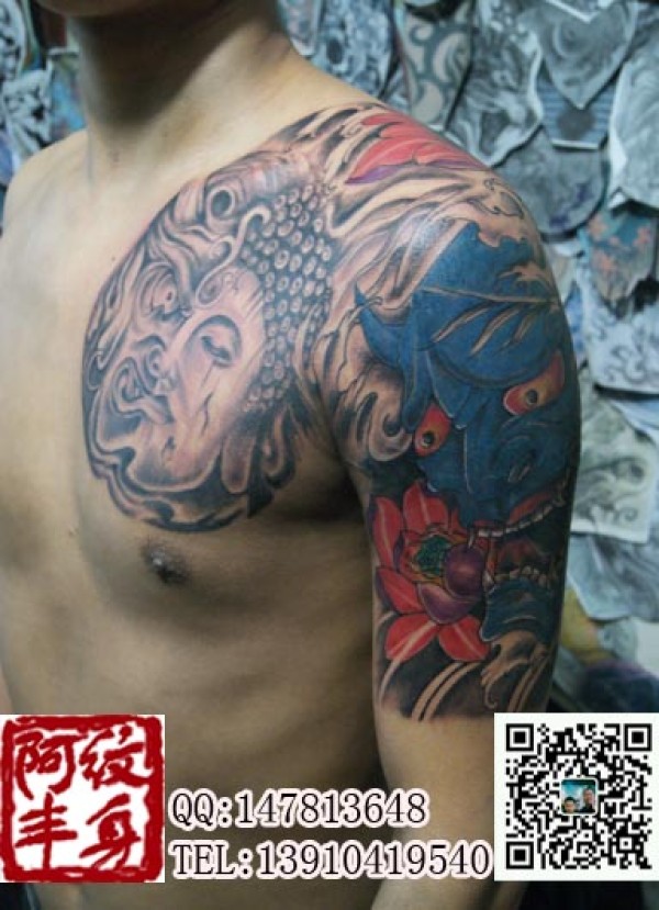 臂膀般若加胸前佛头半甲纹身全过程图纹身整体_般若纹身图案大全_纹身图吧