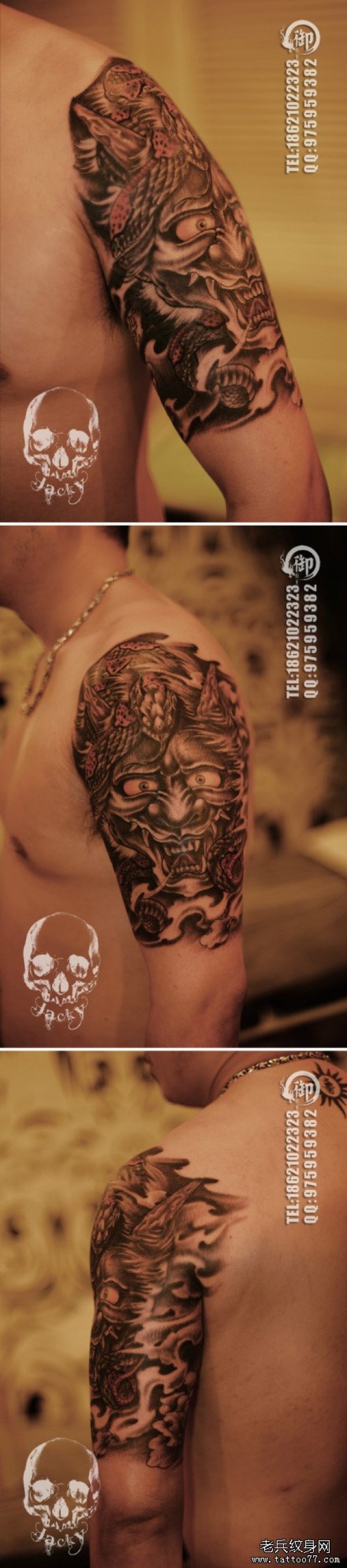 男人后肩背时尚经典的黑灰般若纹身图案_般若纹身图案大全_纹身图吧
