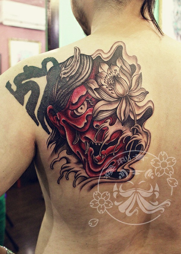 男人后肩背时尚经典的黑灰般若纹身图案_般若纹身图案大全_纹身图吧