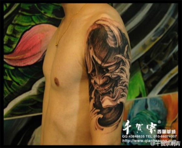 男人后肩背时尚经典的黑灰般若纹身图案_般若纹身图案大全_纹身图吧