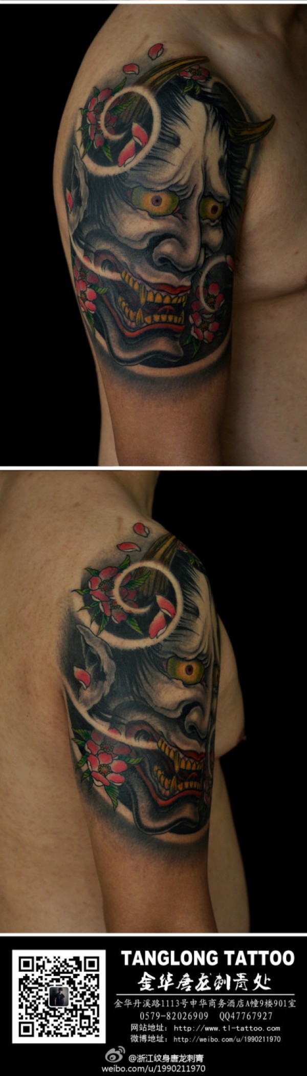 男人后肩背时尚经典的黑灰般若纹身图案_般若纹身图案大全_纹身图吧