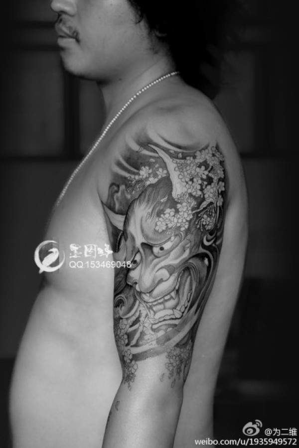 男人后肩背时尚经典的黑灰般若纹身图案_般若纹身图案大全_纹身图吧