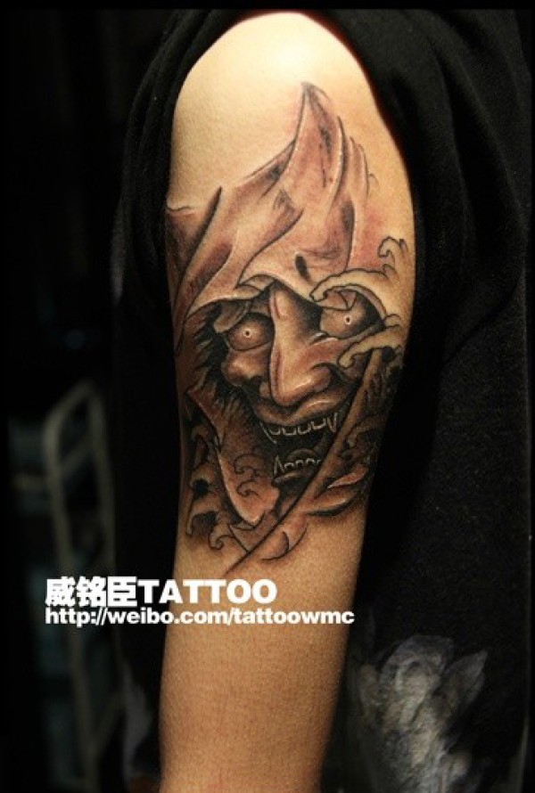 男人后肩背时尚经典的黑灰般若纹身图案_般若纹身图案大全_纹身图吧