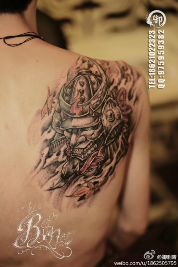 男人后肩背超酷的盔甲般若纹身图案_般若纹身图案大全_纹身图吧