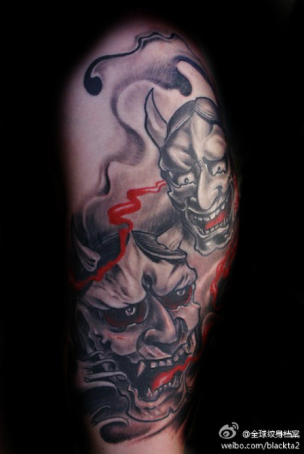 男人腿部经典帅气的黑灰般若纹身图案_般若纹身图案大全_纹身图吧