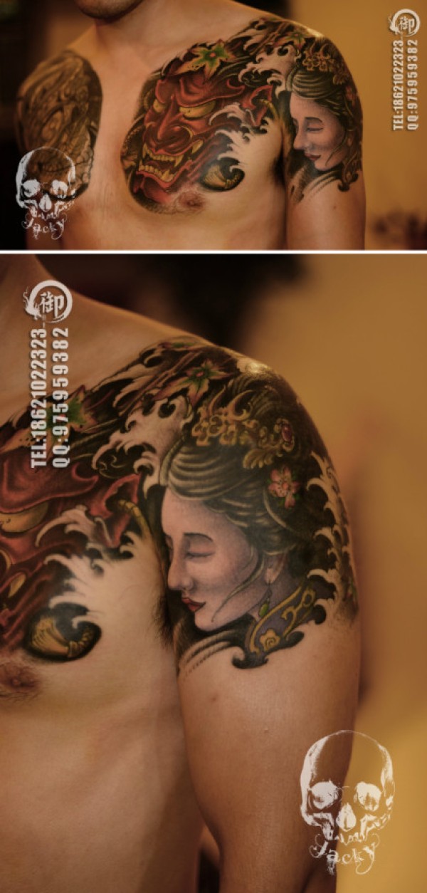 一款经典漂亮的半胛般若与艺妓纹身图案_般若纹身图案大全_纹身图吧