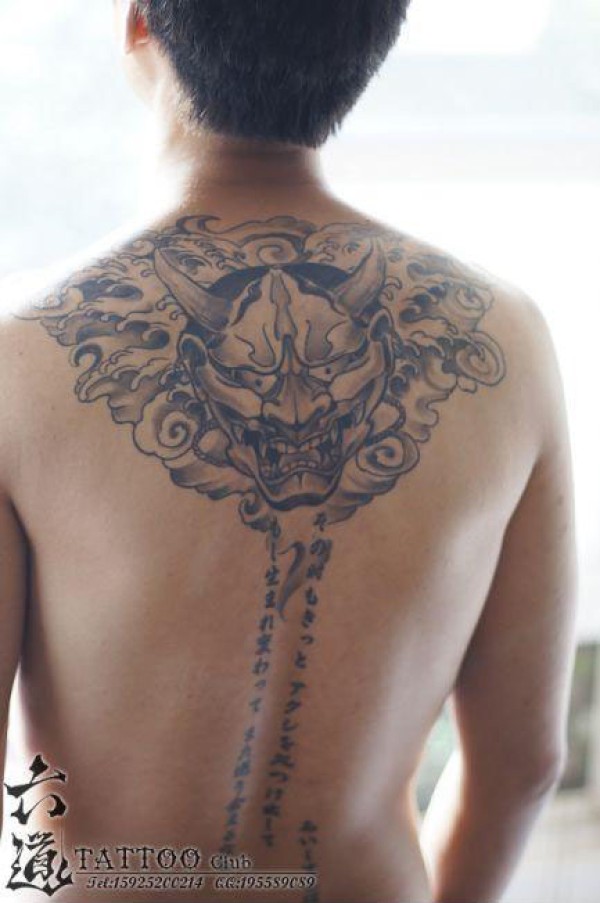 男人后肩背时尚经典的黑灰般若纹身图案_般若纹身图案大全_纹身图吧