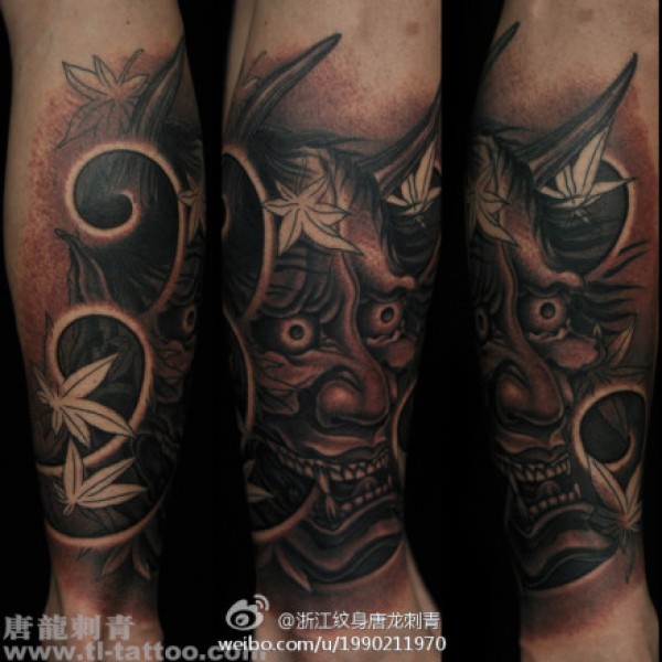 男人腿部经典帅气的黑灰般若纹身图案_般若纹身图案大全_纹身图吧