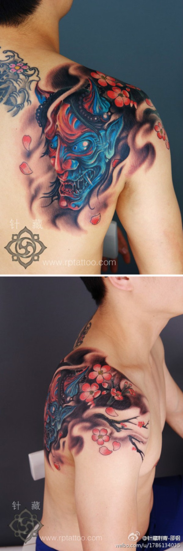 男人后肩背时尚经典的黑灰般若纹身图案_般若纹身图案大全_纹身图吧