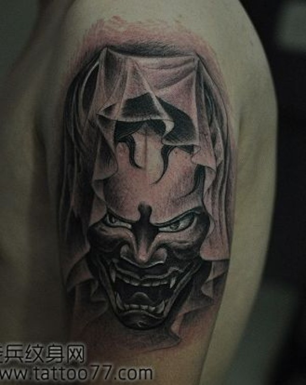 男人后肩背时尚经典的黑灰般若纹身图案_般若纹身图案大全_纹身图吧