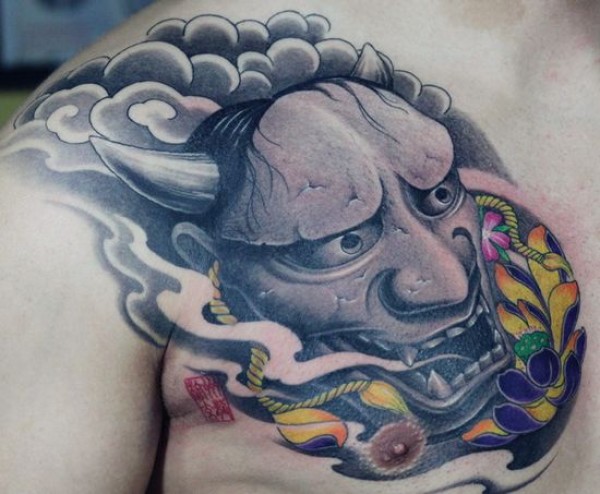 男人后肩背时尚经典的黑灰般若纹身图案_般若纹身图案大全_纹身图吧