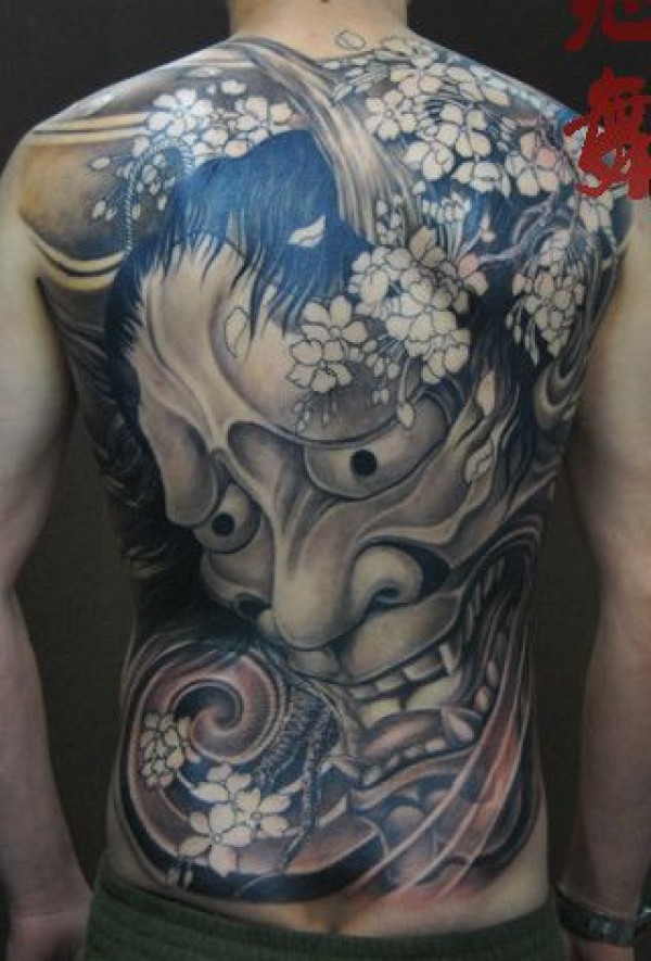 男人后肩背时尚经典的黑灰般若纹身图案_般若纹身图案大全_纹身图吧