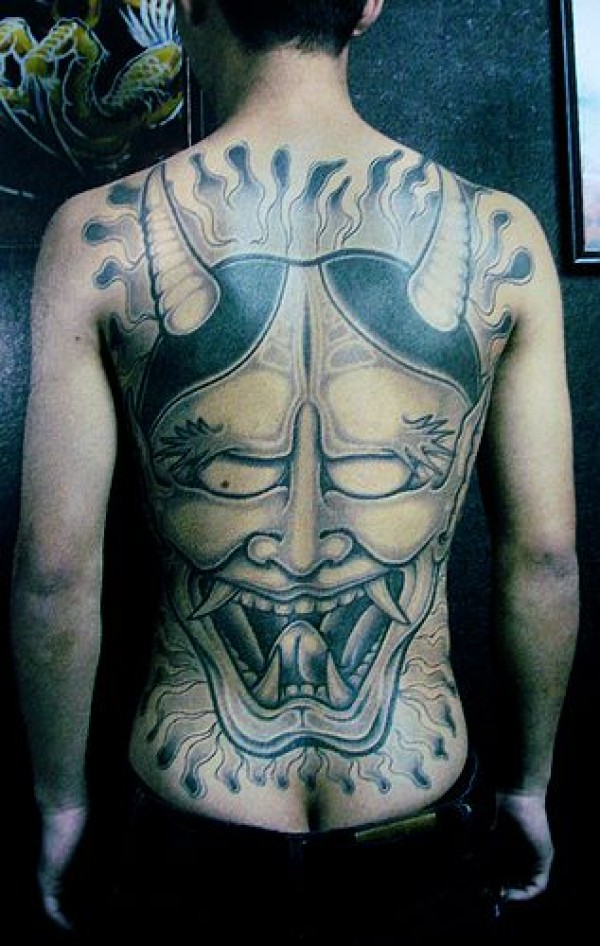 男人后肩背时尚经典的黑灰般若纹身图案_般若纹身图案大全_纹身图吧