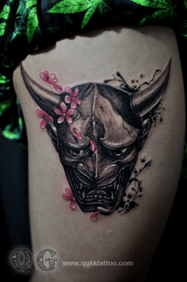 腿部帅气潮流的彩色般若纹身图案_般若纹身图案大全_纹身图吧