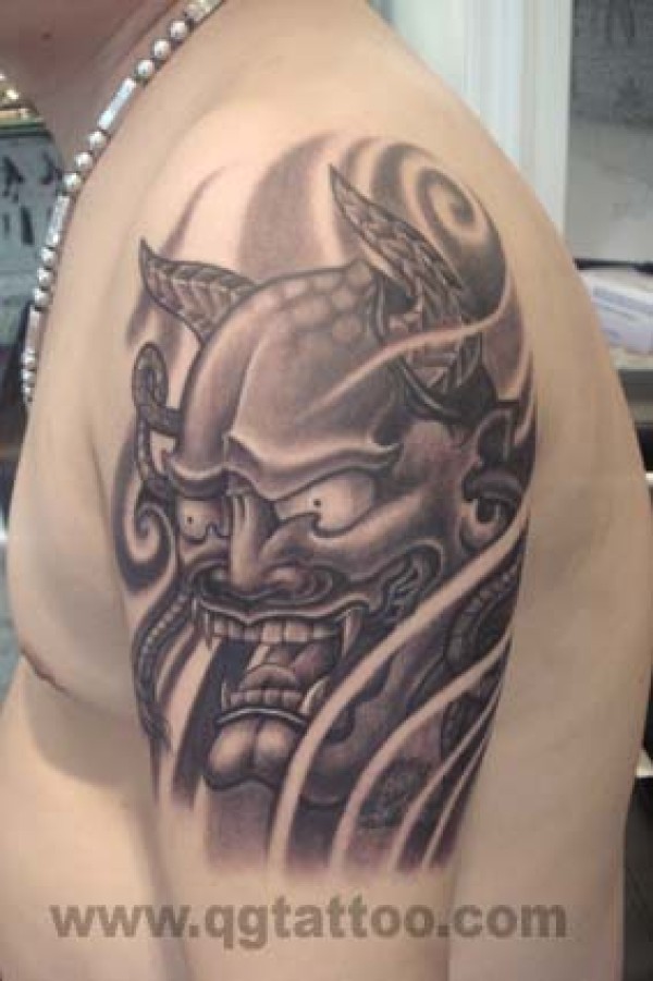 男人后肩背时尚经典的黑灰般若纹身图案_般若纹身图案大全_纹身图吧
