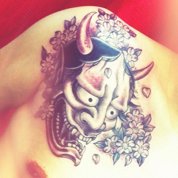 男人后肩背时尚经典的黑灰般若纹身图案_般若纹身图案大全_纹身图吧
