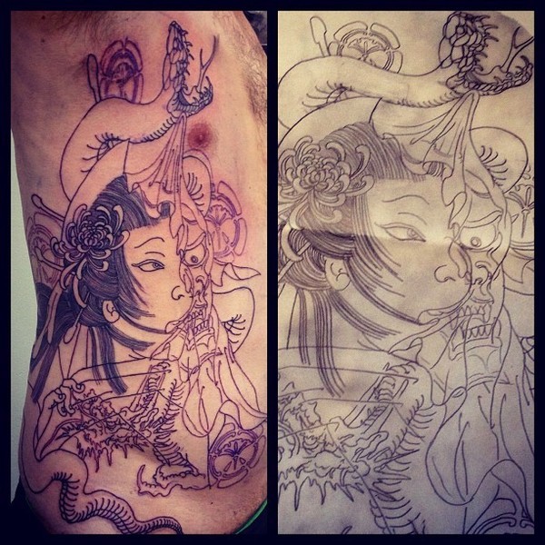 男人腿部经典帅气的黑灰般若纹身图案_般若纹身图案大全_纹身图吧