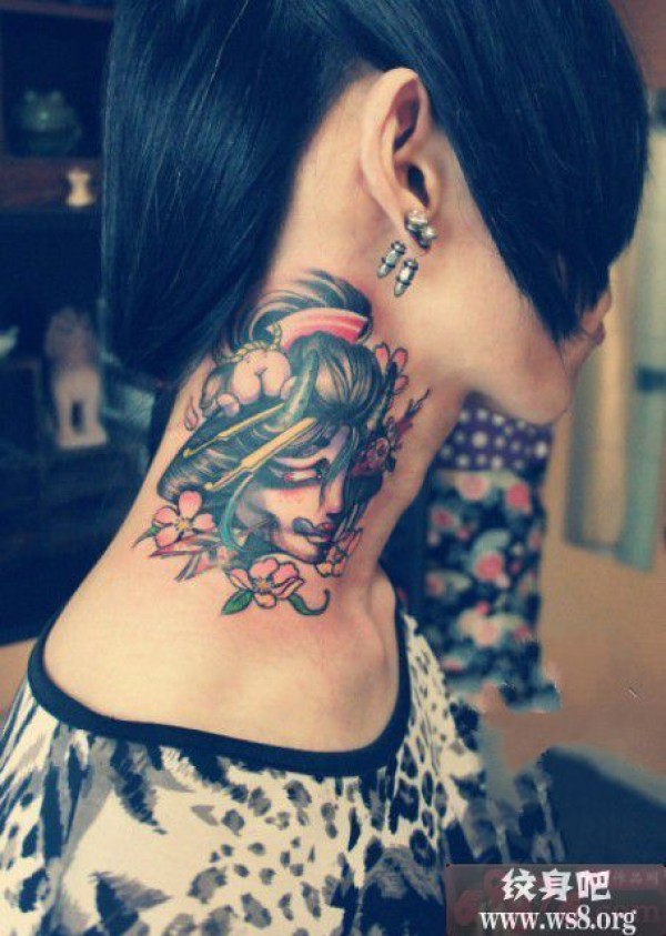 个性艺妓脖子霸气纹身图案_脖子纹身图案大全_纹身图吧