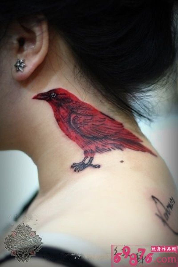 女生个性红色小鸟纹身_脖子纹身图案大全_纹身图吧