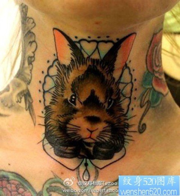 脖子处很酷潮流的兔子纹身图片_脖子纹身图案大全_纹身图吧