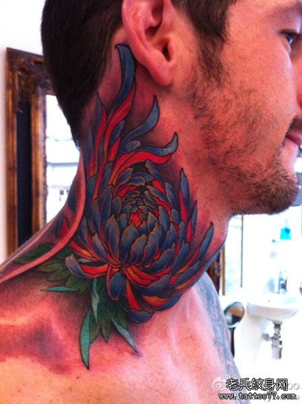 男人脖子处好看的彩色菊花纹身图案_脖子纹身图案大全_纹身图吧