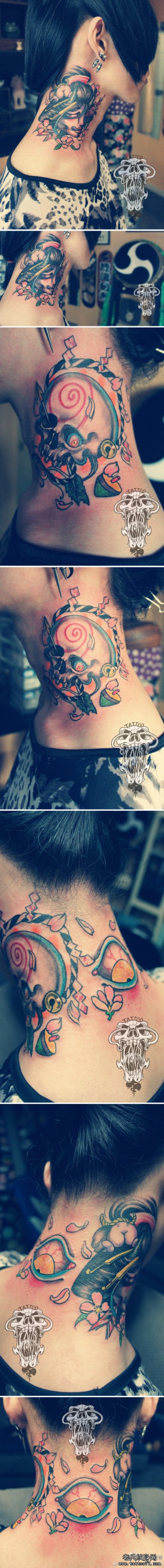 脖子处潮流经典的艺妓骷髅与眼睛纹身图案_脖子纹身图案大全_纹身图吧